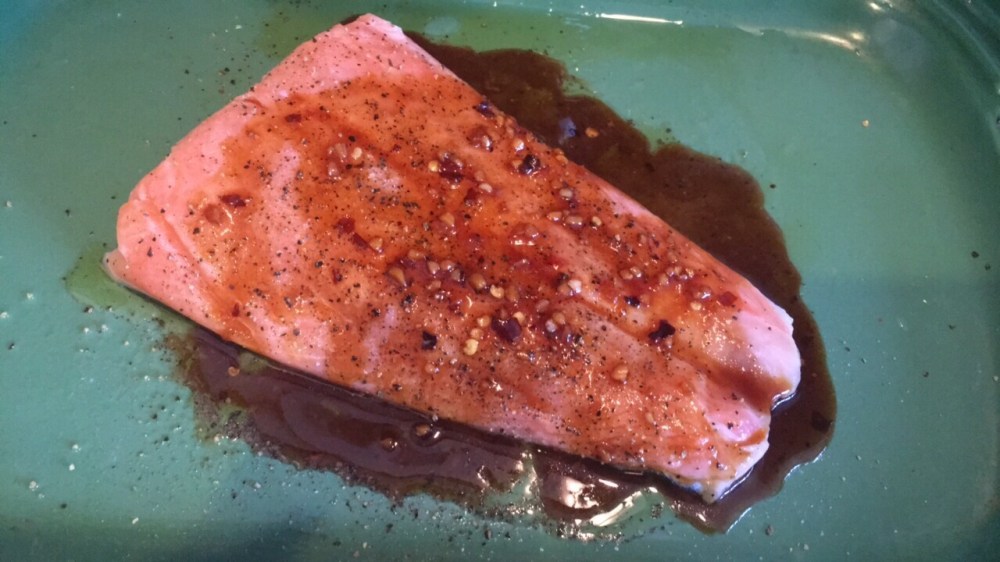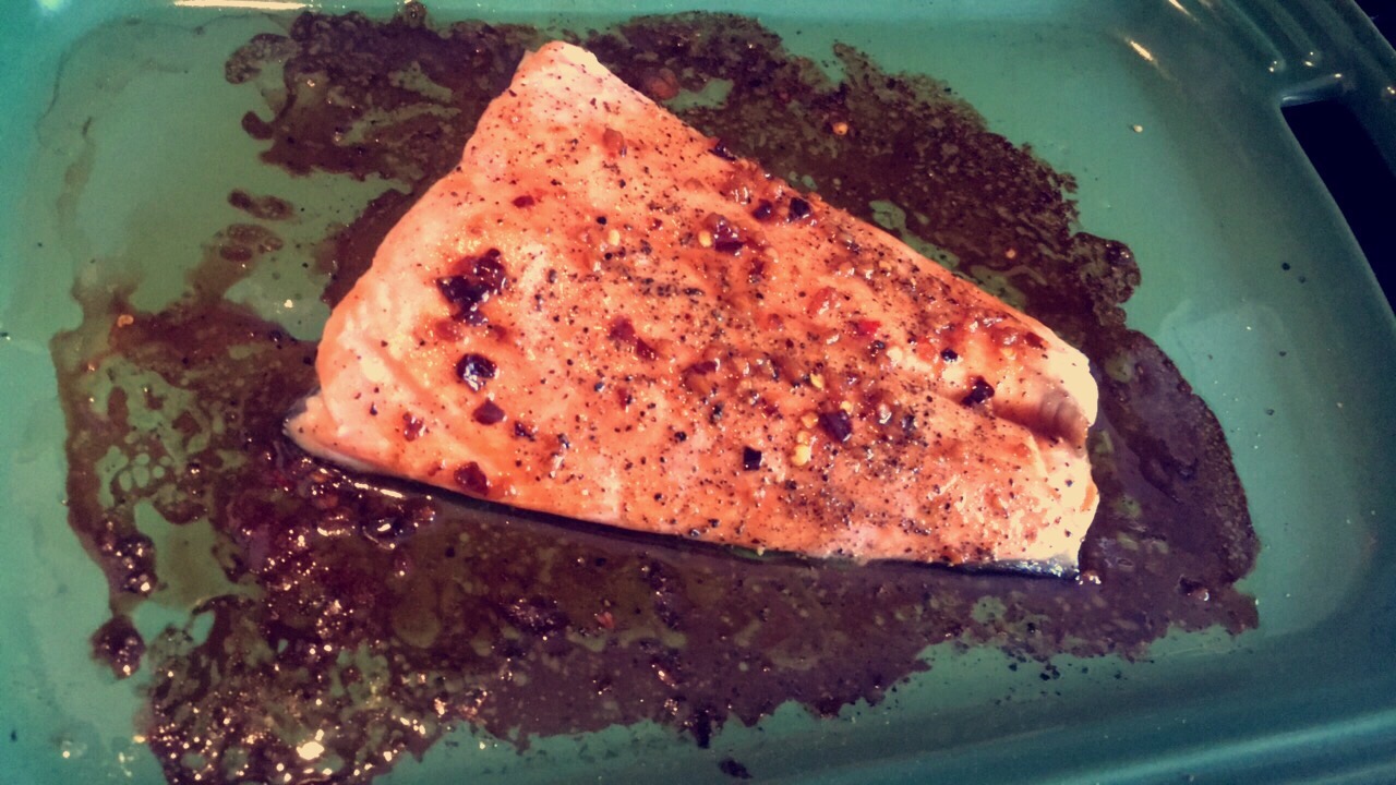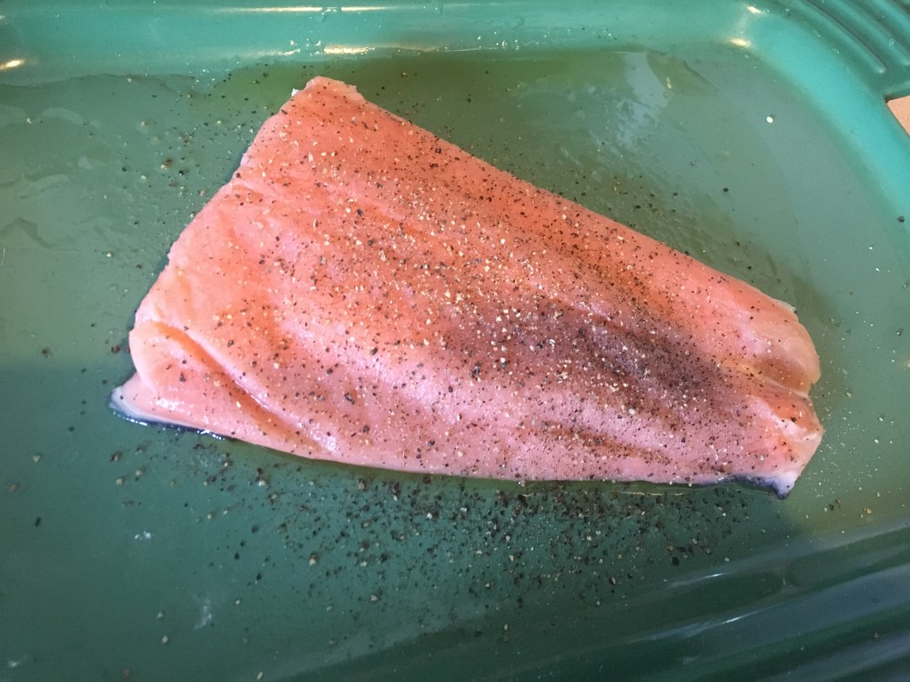 While your house starts to smell marvelous get a baking dish and oil it up with olive oil and season your salmon with salt & pepper a dash of adobo