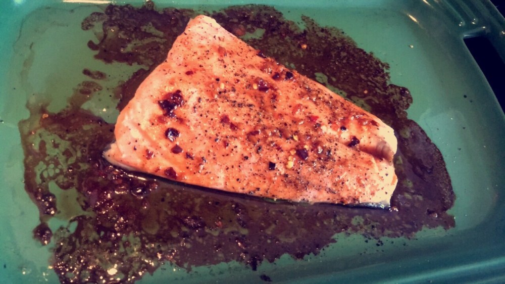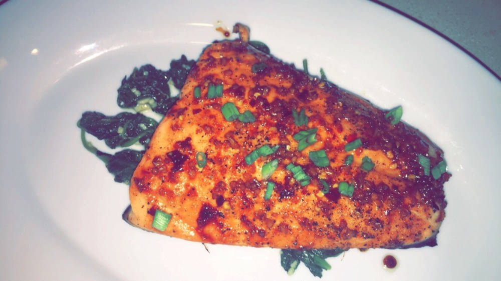 Top the salmon with chopped scallions and Enjoy! Pictured below is the salmon over some sautéed spinach