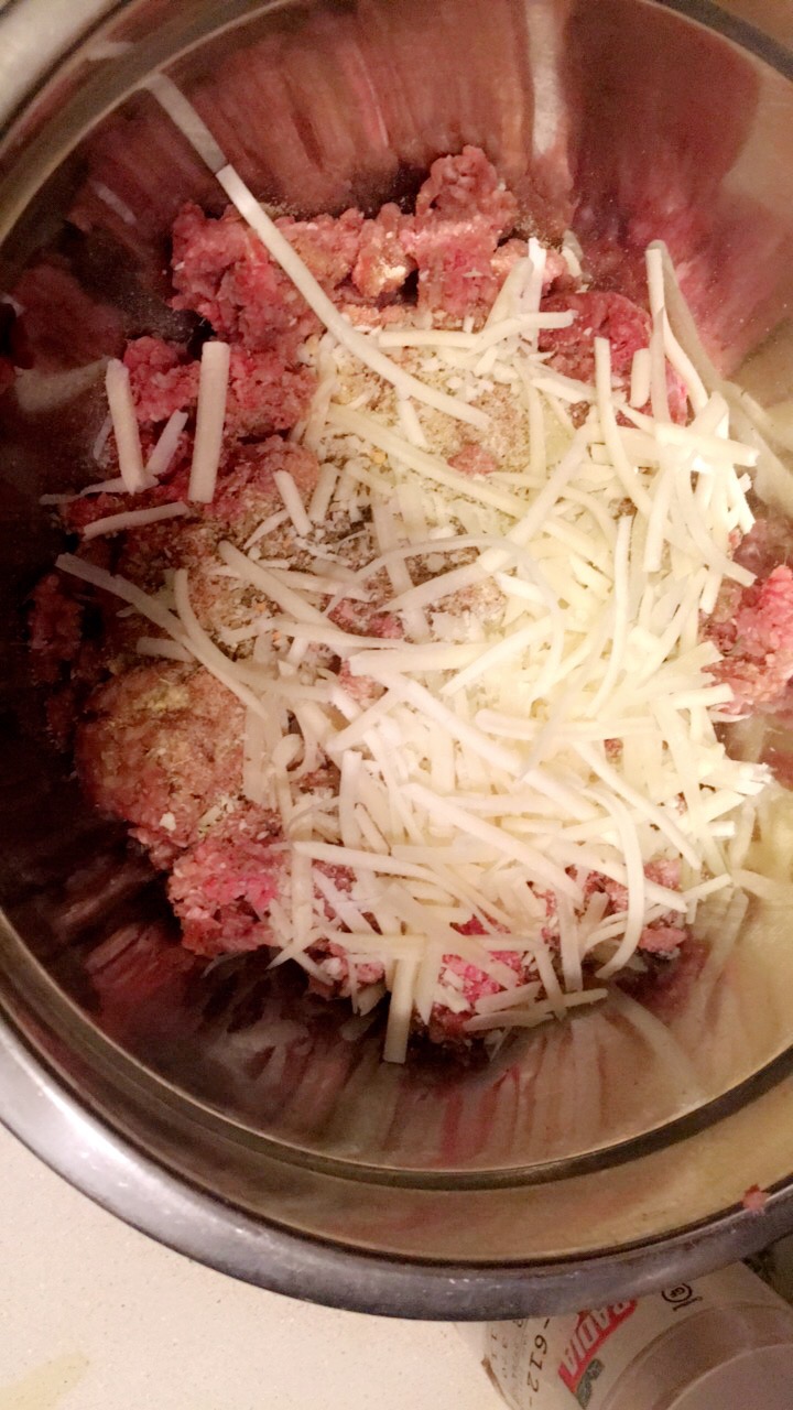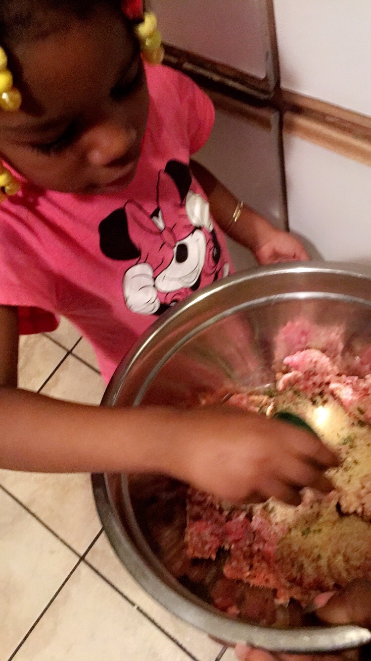 In a deep bowl mix all meatball ingredients together starting with dry then wet ingredients with your hands get everything incorporated lucky for me my daughter was my sous chef for this meal