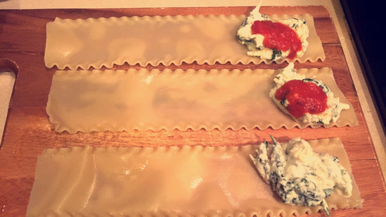 Next step is to start the assembly of the lasagna rolls. Add filling and top with a spoon of tomatoe sauce.