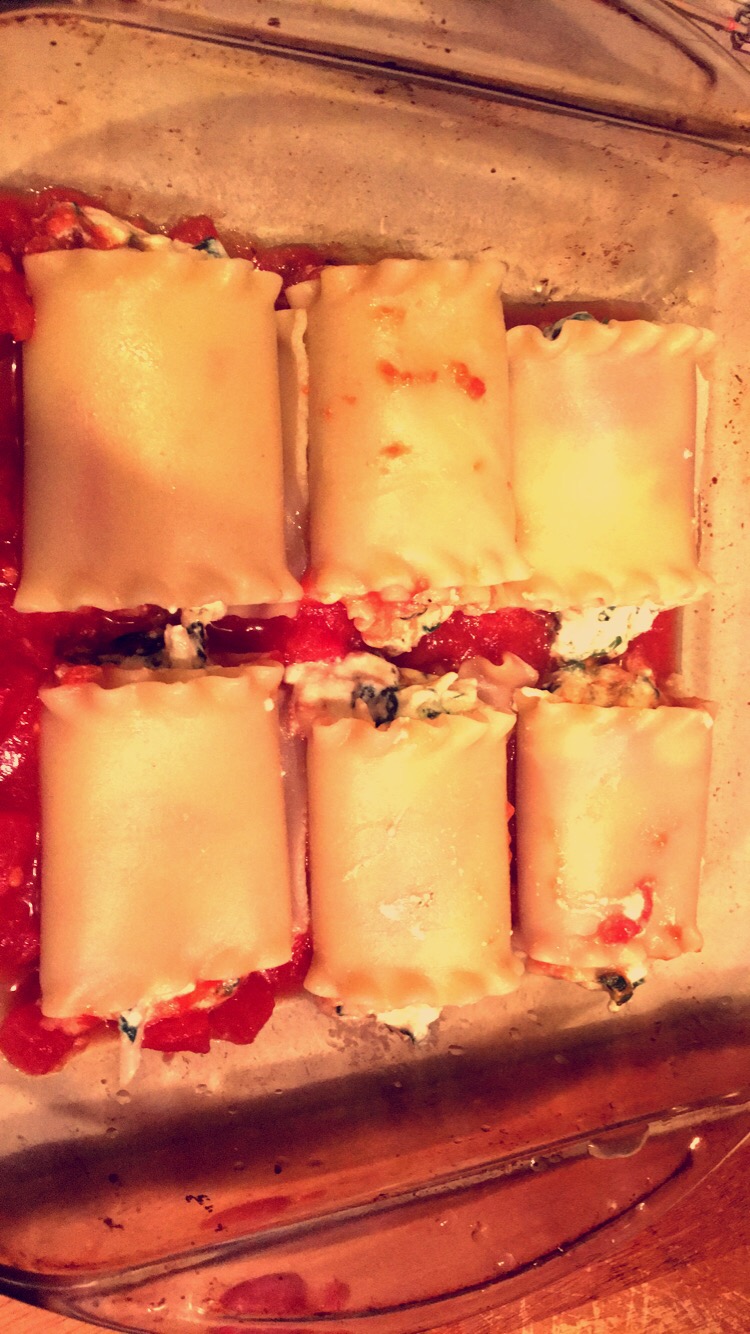 In a prepared baking dish fill bottom with remaining tomatoe sauce and add lasagna rolls