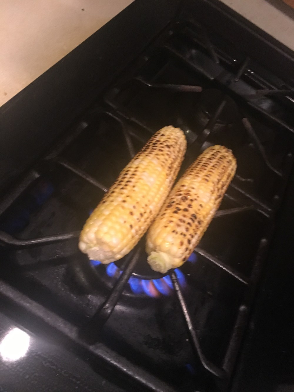 It’ll start popping and crackling but don’t be alarmed this is what you want to hear. Keep a close eye on the corn turning 2-3 min intervals on each side so that the corn can get that dark color