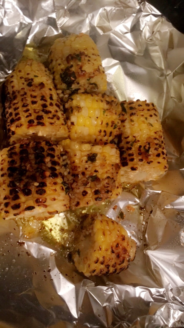 After corn is done roasting I cut it into smaller pieces or you can leave it whole. Place corn in oven safe dish lined with foil and pour the butter mixture on top. Allow the corn to fish cooking in the oven for 20-25 min and that’s it ! Super easy simple and yummy ENJOY