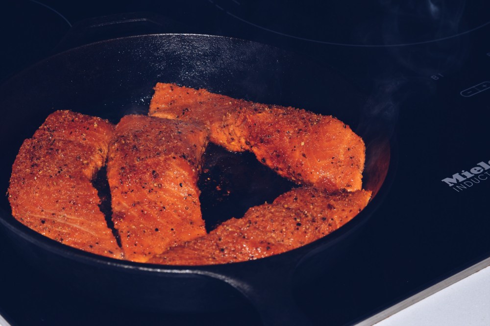 Heated up that Miele stove top and used a cast iron pan (the one I mentioned previously in my steak blog post) added some olive oil to the pan and began to sear the salmon to get blackened color about 4-5 min per side.