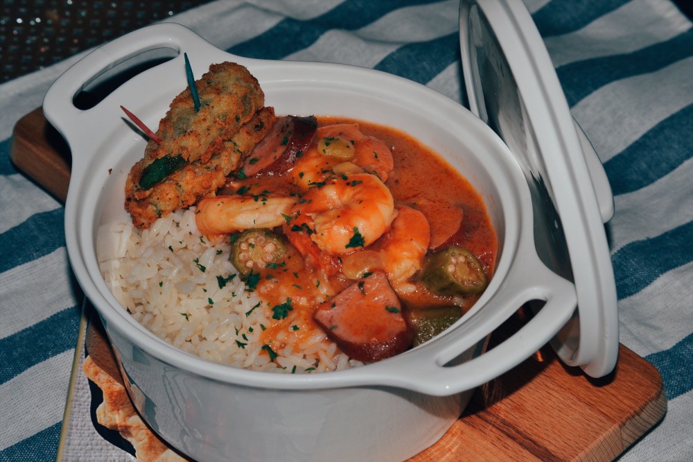 After your gumbo has simmered add in your shrimp give it a stir and allow to simmer. Cook shrimp until it is opaque, taste and season with salt and pepper if necessary.