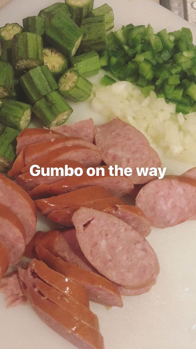 Stir the roux for about 15- 22 min till it gets a light brown color be very careful to not burn the roux mixture. When your roux reaches your desired color slowly stir in the onions, bell peppers and okra stirring as needed so the veggies don’t tick to the bottom of the pot for about 8-10 minutes. When the veggies get soft add in the garlic and andouille sausage and bay leaves.